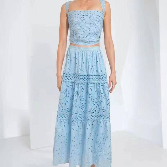 Zola Set aus Oberteil und Rock mit floraler Stickerei und Häkelspitze
