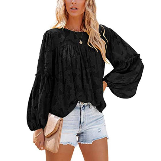Andrea Ausgestellte Ärmel Rundhalsausschnitt Jacquard Chiffon Top