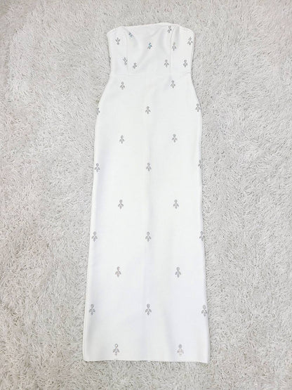Ein echter Hingucker für jede Party! Dieses elegante Maxikleid überzeugt mit funkelnden Diamant-Verzierungen, einem figurbetonten Bandage-Stoff und einem schicken Quadratkragen. Perfekt für besondere Anlässe, Abendevents oder Fashion-Statements.